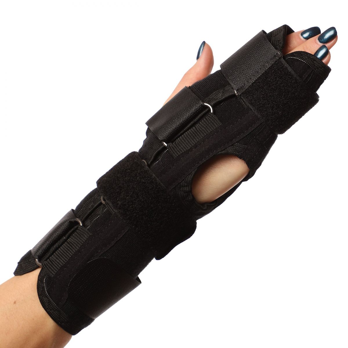 - Имеет съемную пластиковую шину анатомической формы по ладонной поверхности длиной 24 см, которая исключает сгибание в лучезапястном суставе