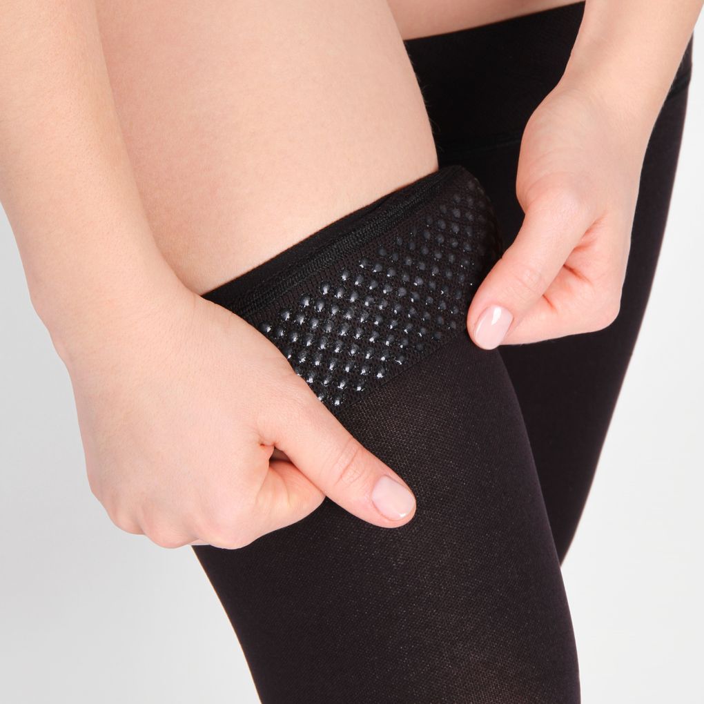 для чулок с силиконовой лентой – не смазывать кремом или мазью ту часть ноги, куда приклеивается силиконовая лента;