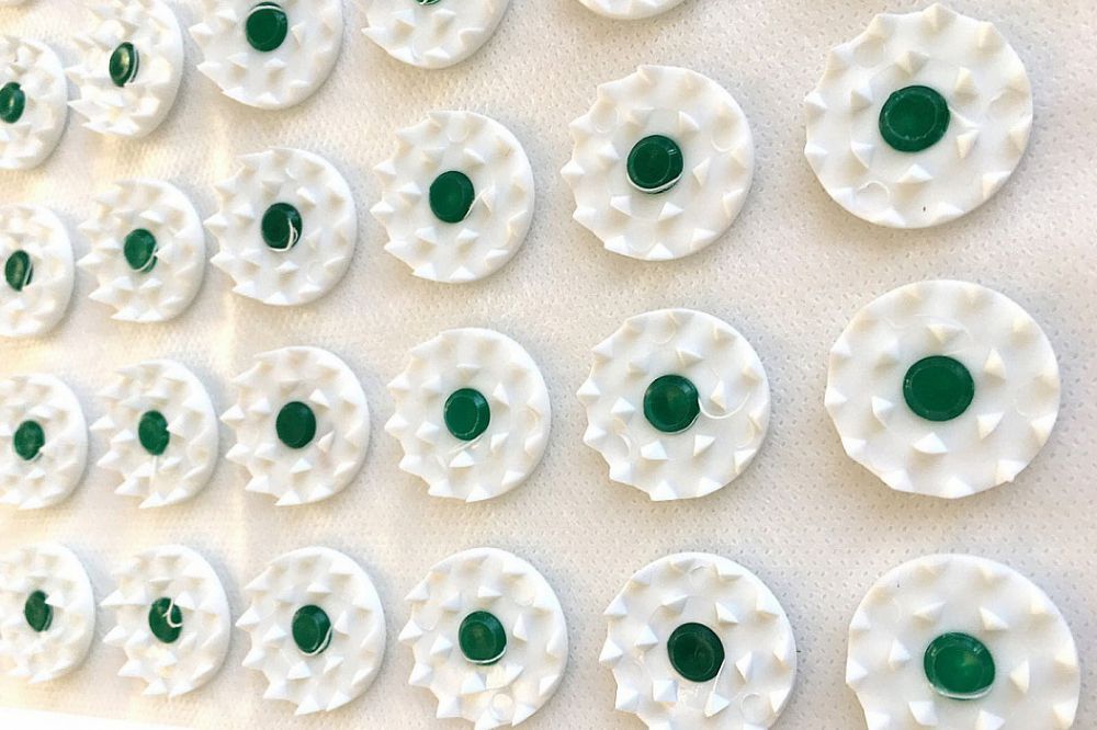 Описание: Аппликатор представляет собой круглые изделия с иглами из нетоксичной пластмассы, закрепленные на плотной гигиенически чистой основе – пленке п/э или спантексе при помощи кнопки из идентичных материалов.