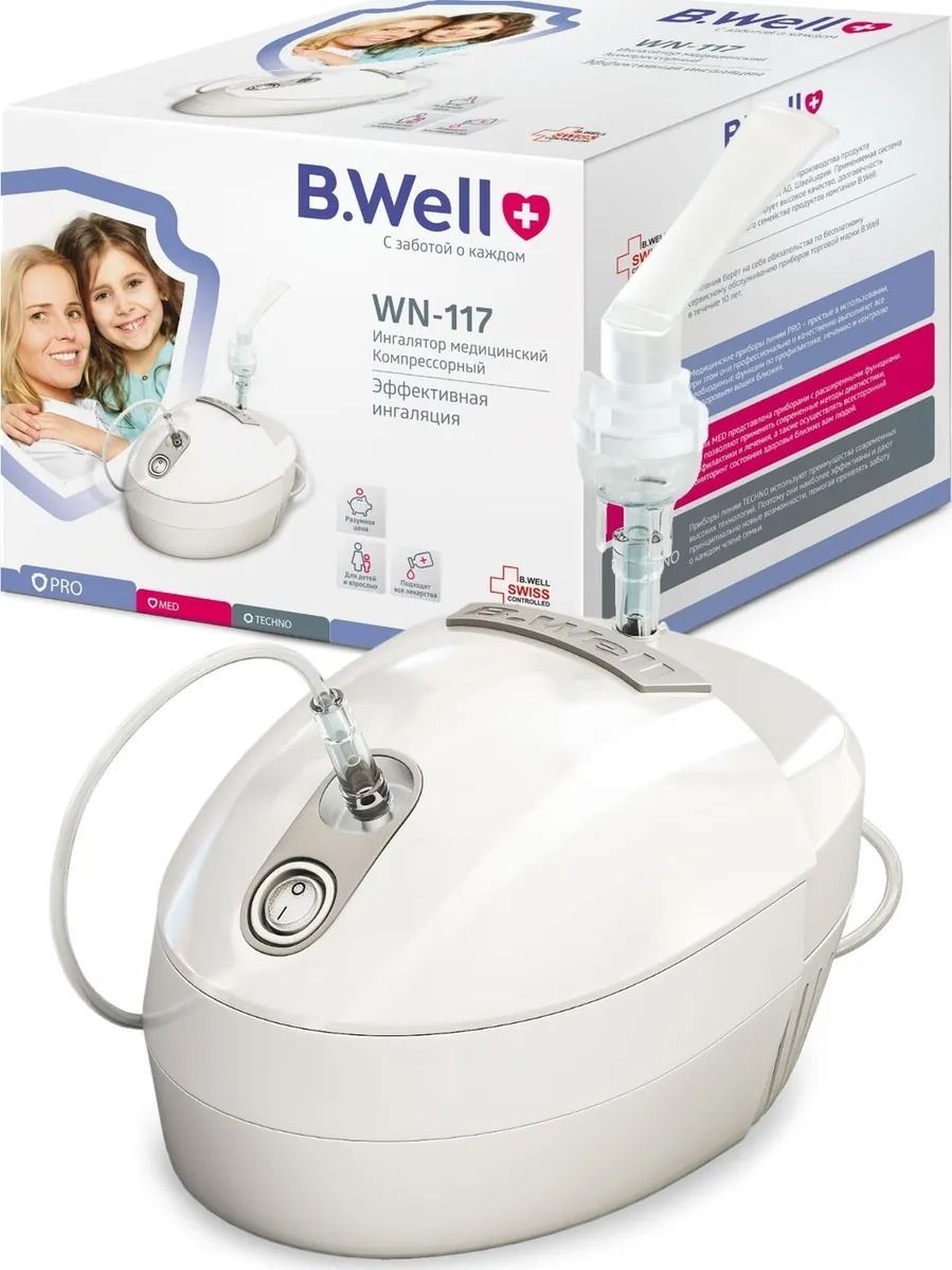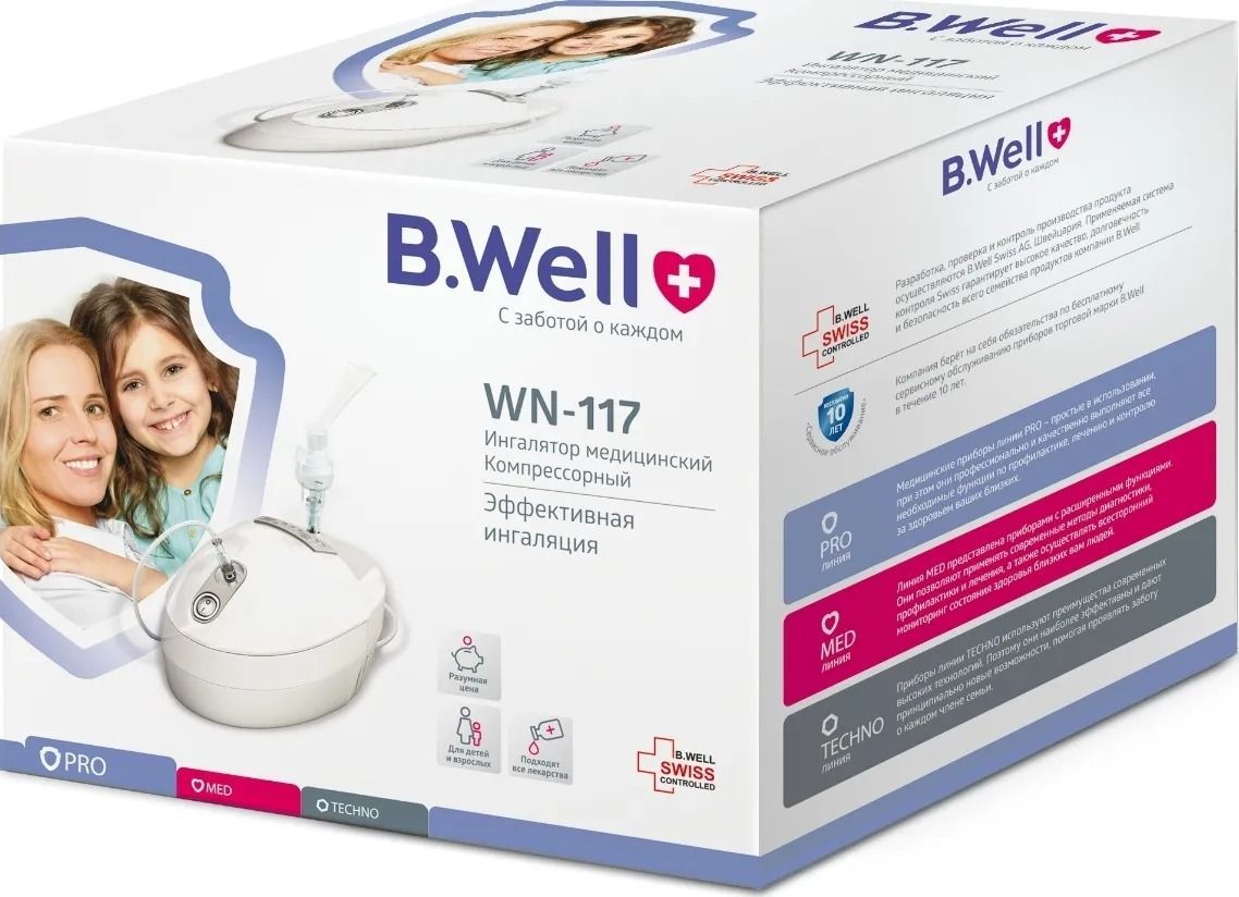 Небулайзер B.Well WN-117 отличается высокой степенью надежности. Компрессор подает мощный поток воздуха в специальную камеру. Сильная струя воздуха разбивает лекарственный препарат на сверхмалые частицы. В таком виде через маску или мундштук лекарственное средство поступает к пациенту в организм. Режим работы небулайзера прерывистый: 30 минут работает и 30 минут выключен. Надежный и долговечный прибор с температурной защитой от перегрева, предназначен для стационарного использования в домашних условиях.
