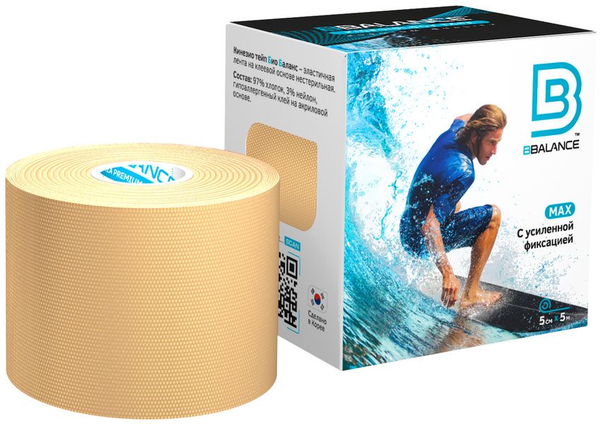 Кинезио тейпы с усиленным клеем BBalance Tape (BBTape) серии MAX подойдут для тейпирования участков тела, постоянно находящихся в движении или подверженным дополнительному трению (колени, локтевые суставы, лодыжки и т.д.), а также для тех людей, кто занимается водными видами спорта и много времени проводит в воде. На поверхность тейпа нанесен дополнительный гипоаллергенный клей на акриловой основе, благодаря чему тейп дольше держится и оказывает более длительный терапевтический эффект. С кинезио тейпами BBTape MAX Вы можете не опасаться, что тейп отклеиться, и заниматься активными тренировками в обычном режиме!