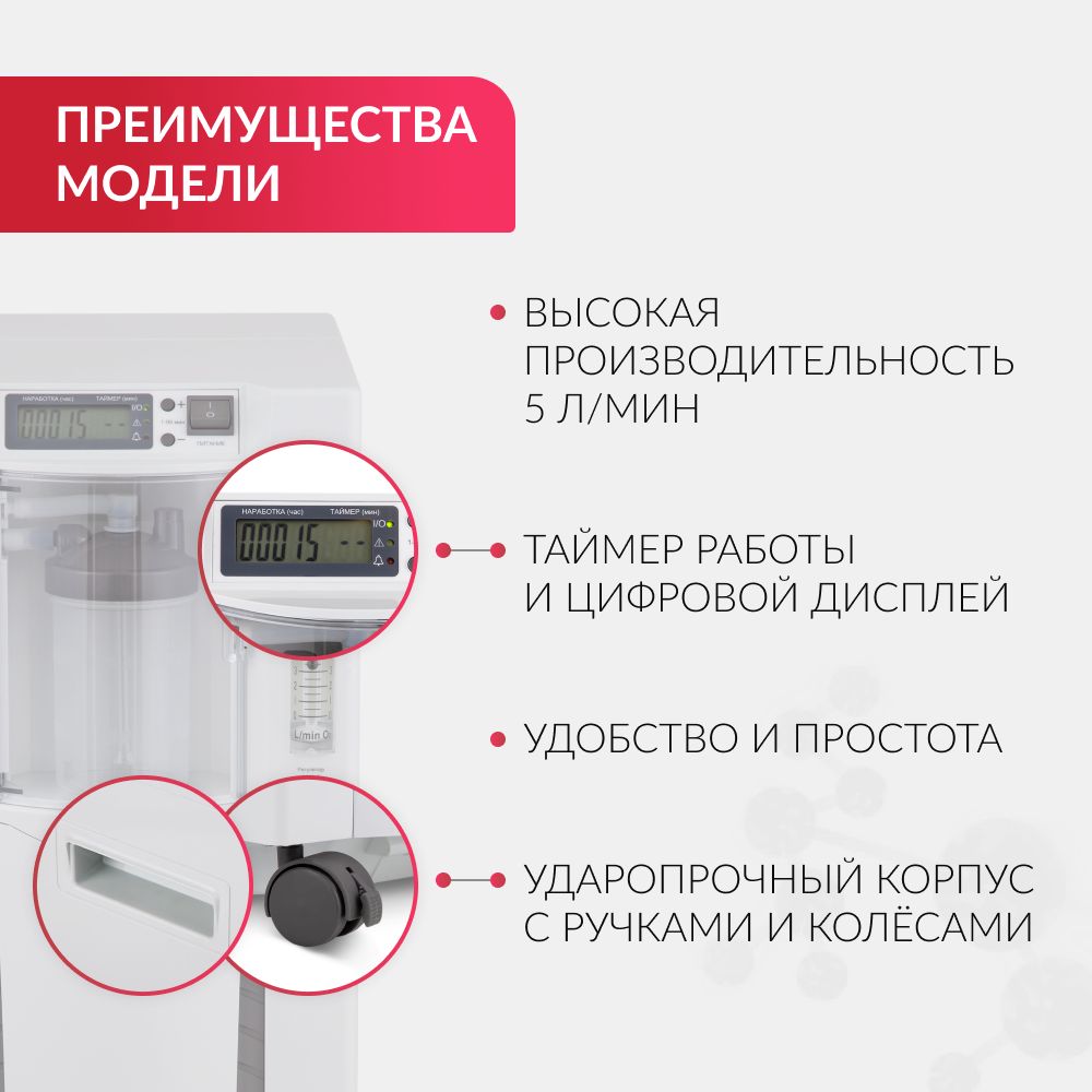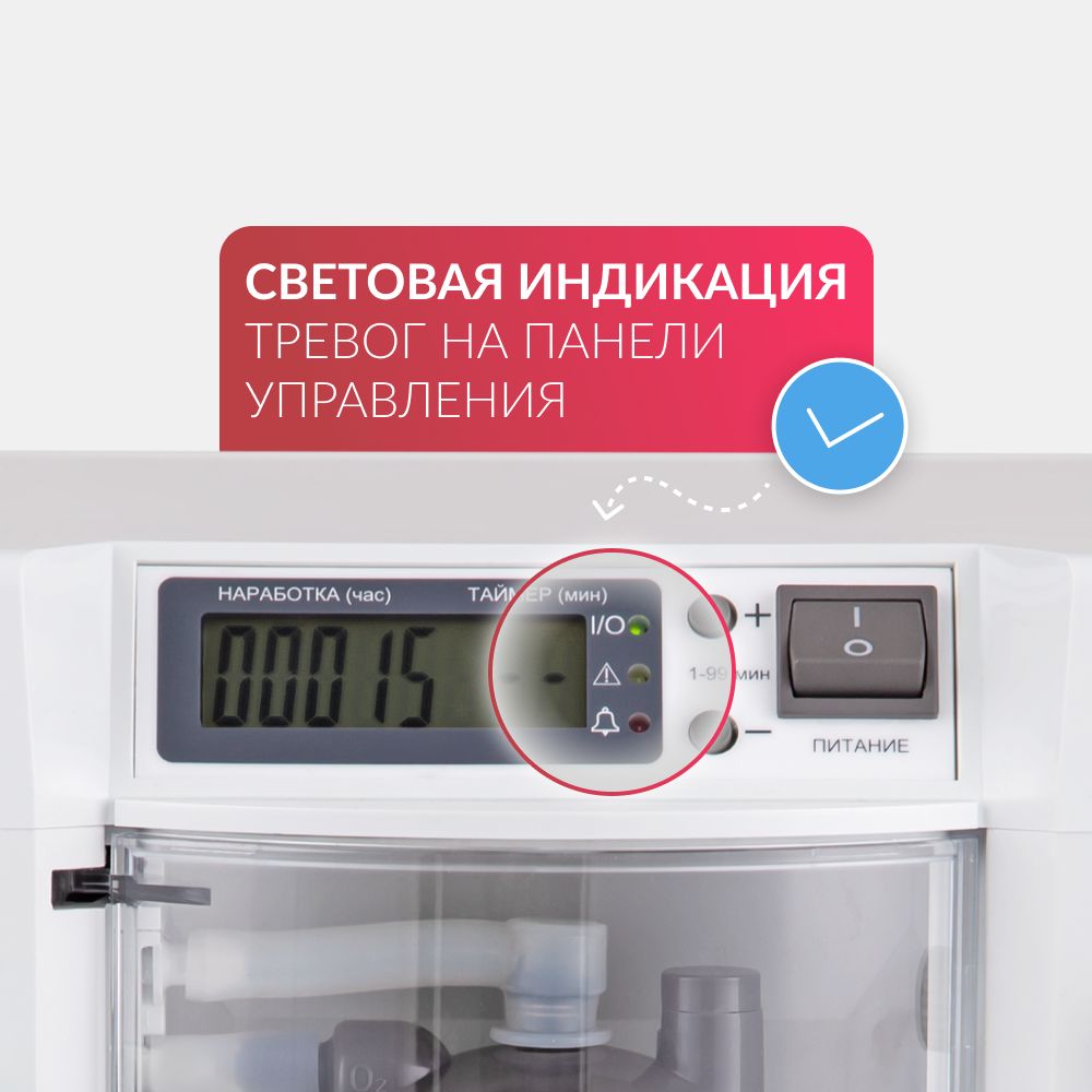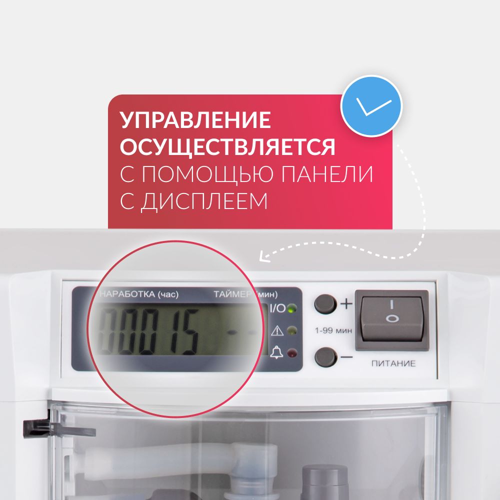 Простое управление. Управление кислородным концентратором осуществляется с помощью интуитивно понятной панели с дисплеем, на котором отображаются настройки рабочего таймера. Имеется световая индикация ошибок.