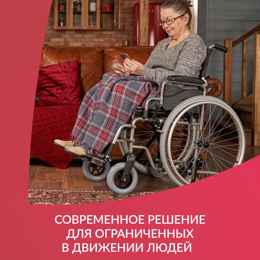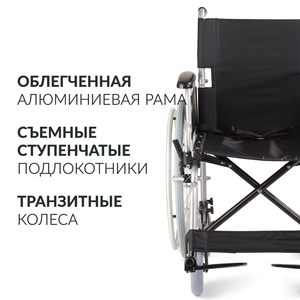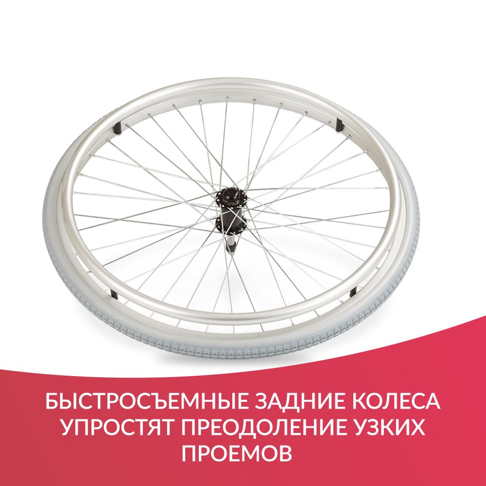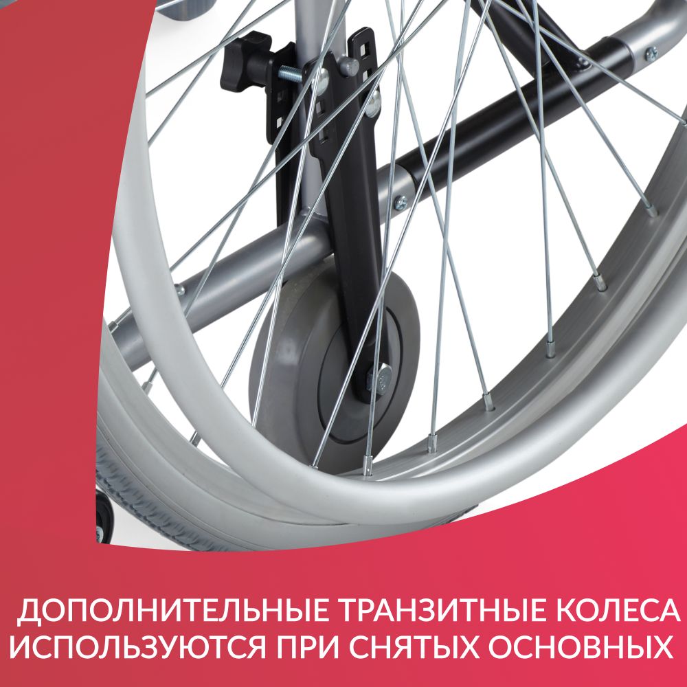 Для быстрого преодоления дверных проемов при снятии задних колес предусмотрены дополнительные транзитные цельнолитые колеса. Так сопровождающему легче провезти коляску с человеком.