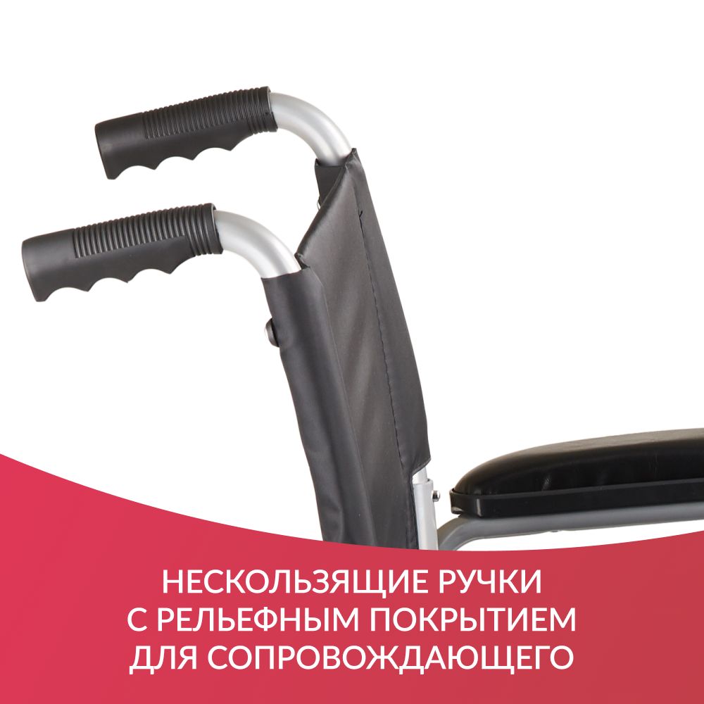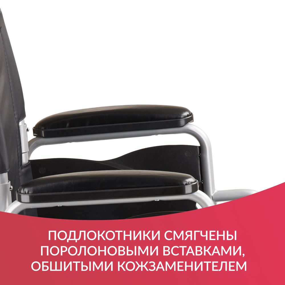 Спинка и сиденье сделаны из прорезиненного полиэстера. Ступенчатые подлокотники смягчены поролоновыми вставками, обшитыми кожзаменителем. Для простоты усаживания и вставания подлокотники можно снять, нажав на кнопочный фиксатор. Для удобства сопровождающего предусмотрены ручки с рельефным покрытием, защищающие от соскальзывания и замерзания рук.