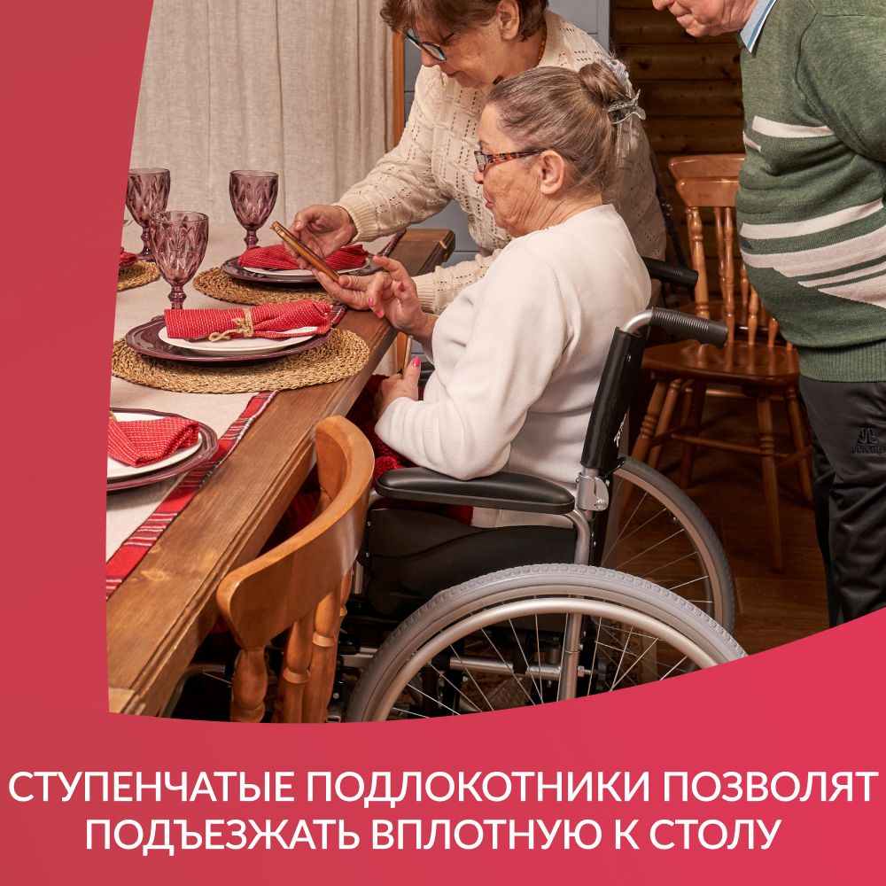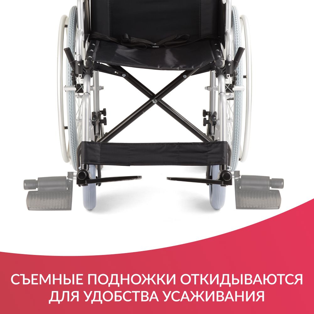 Подножки съемные, откидываются при помощи рычага для удобства усаживания и сокращения длины коляски. Эти простые свойства позволяют сидящему без ограничений передвигаться по дому и пользоваться мебелью и, к примеру, обеденным столом.