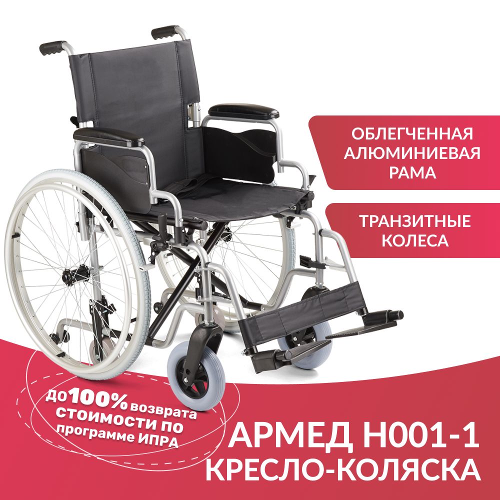 Кресло-коляска Н 001-1 отличается облегченной алюминиевой рамой и наличием быстросъемных задних колес, а также парой дополнительных маленьких колесиков, которые помогают преодолевать узкие дверные и лифтовые проемы при снятых основных колесах. Антиопрокидыватели поддерживают уверенное положение при наезде на уклон или препятствие, они также оснащены колесами. Складная рама, съемные подножки и подлокотники позволяют перевозить коляску даже в небольшом багажнике автомобиля.