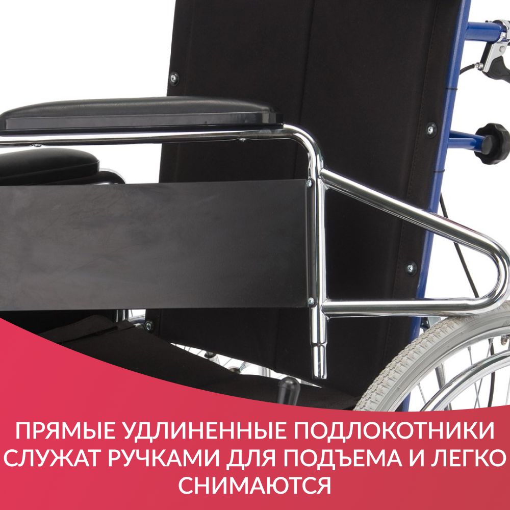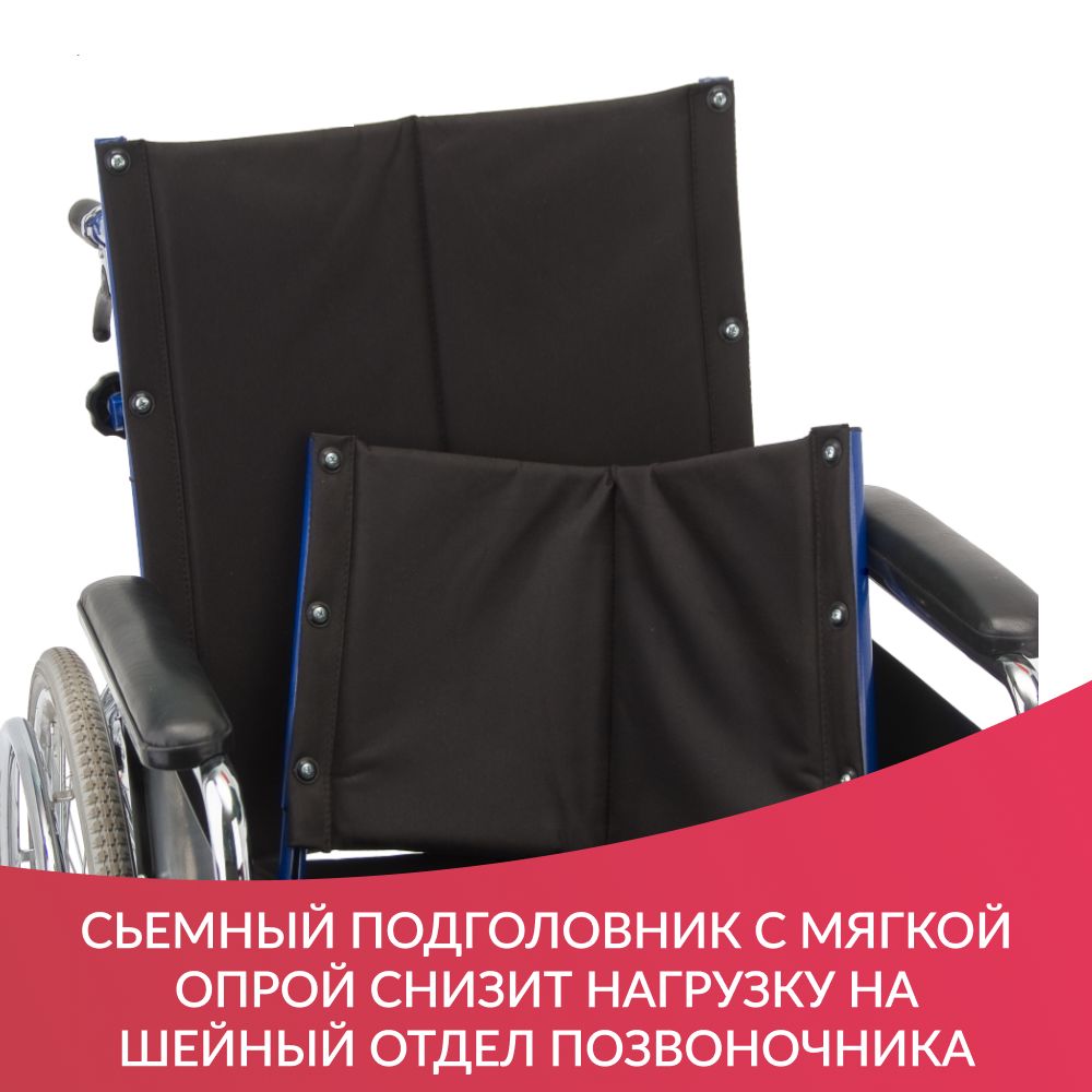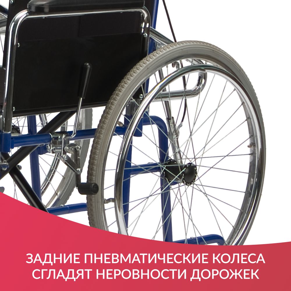 Спинка и сиденье изготовлены из мягкого, прочного, влагонепроницаемого материала. Для свободы рук пользователя и удобства пользования мебелью предусмотрена возможность снять подлокотники, которые оснащаются мягкими накладками. Подножки поворотные, имеют мягкие упоры для ног. Пневматические задние колеса сглаживают неровности дорожных покрытий, а стояночные тормоза надежно зафиксируют коляску при остановках.