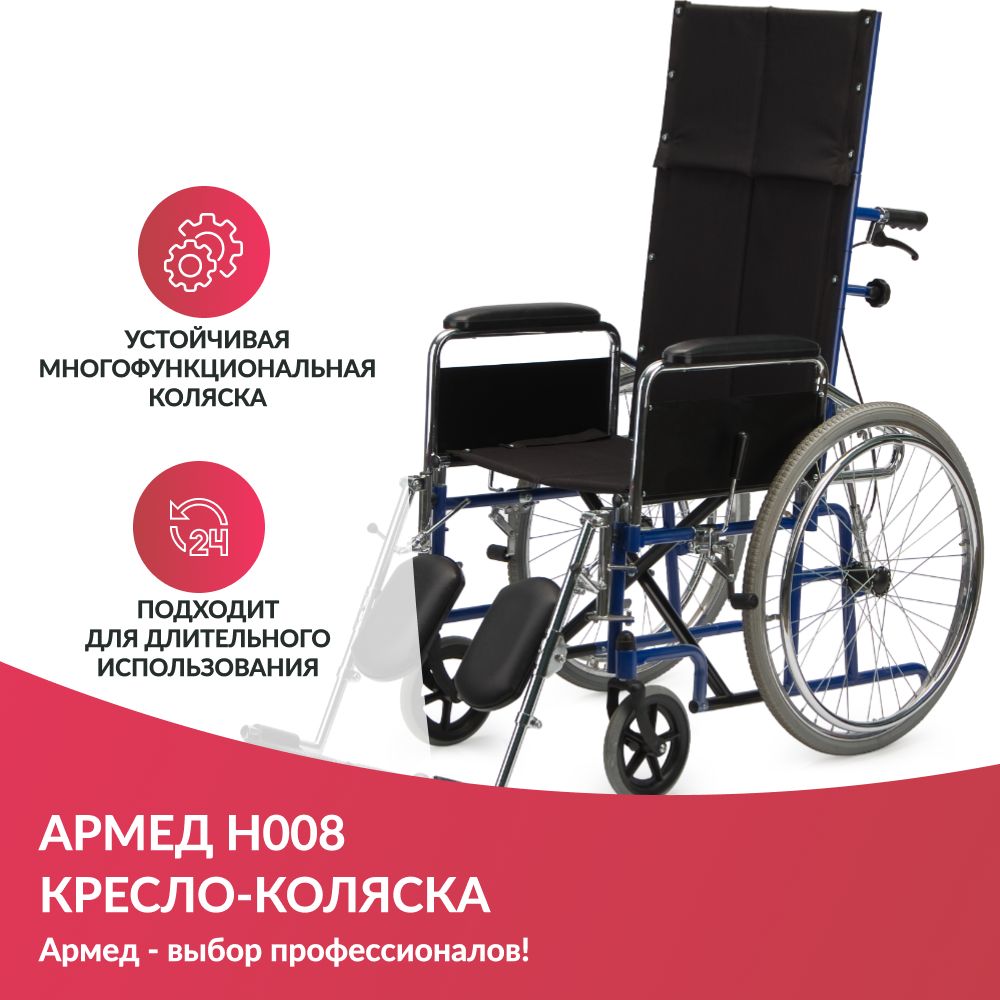 Кресло-коляска Н 008 - удобная модель с регулируемой спинкой, съемным подголовником, удобными подножками, оборудованными мягкими голеностопными опорами, и подлокотниками с накладками. Коляска имеет складную раму, что существенно упрощает хранение и перевозку изделия. Модель оснащена задними пневматическими и передними цельнолитыми колесами. Коляска H008 маневренная и удобная в управлении как дома, так и на улице. Антиопрокидывающее устройство обеспечивает безопасность пользователя.