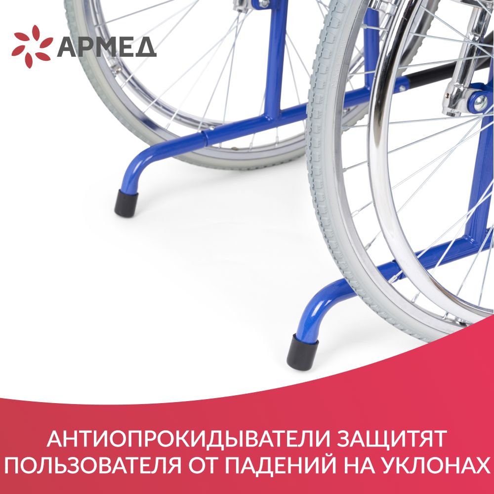 Колесная база модели представлена передними литыми и задними пневматическими маневренными колесами. Преодолевать уклоны и бордюры без риска завалиться назад помогут антиопрокидыватели с противоскользящими наконечниками. Надежно зафиксировать коляску на время остановки позволяют боковые стояночные тормоза.