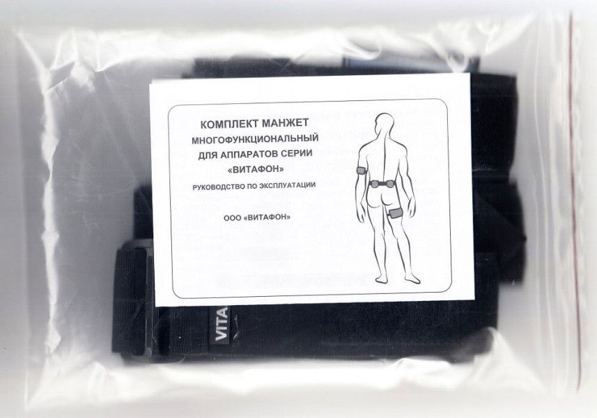 Комплект манжет фиксирующих, многофункциональный, предназначен для индивидуального использования и может применяться для фиксации виброфонов аппаратов серии «Витафон» на туловище и конечностях взрослых и детей. Комплект состоит из длинного, среднего и двух малых ремней и 4 съемных кармашков. Ремни можно последовательно соединять между собой для получения нужного обхвата. Кармашки надеваются на ремень и могут перемещаться по нему. Положение кармашков выбирают так, чтобы виброфоны оказались в нужном месте конечности или на теле и не мешали зафиксировать манжету.