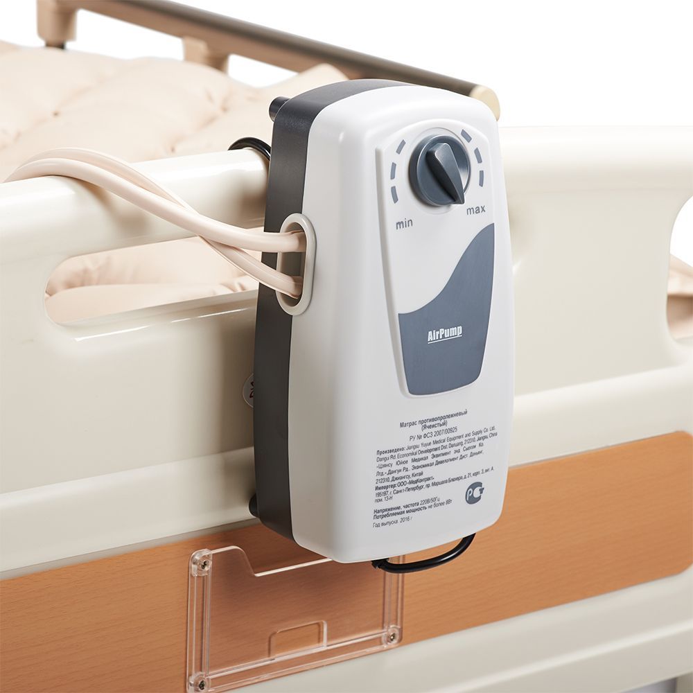 Компрессор оборудован крючками, которые накидываются, например, на боковину кровати для закрепления. Регулировать давление может сам пользователь или обслуживающий человек.
