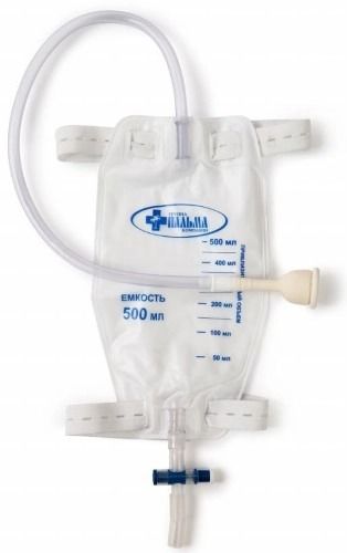 Нижний конец улавливателя мочи соединяется с трубкой мешка-мочеприемника объемом 0,5 л, который закрепляется на бедре или на голени (в зависимости от Вашего желания) эластичными застежками. Мешок опорожняется по мере наполнения с помощью выпускного устройства. Трубка мешка-мочеприемника, имея изначальную длину 50 см, может быть укорочена до нужной длины для удобства расположения мешка на ноге. Сам мешок снабжен мягкой тканью на стороне, прилегающей к ноге.