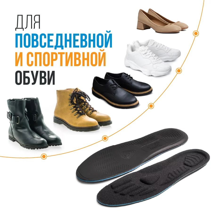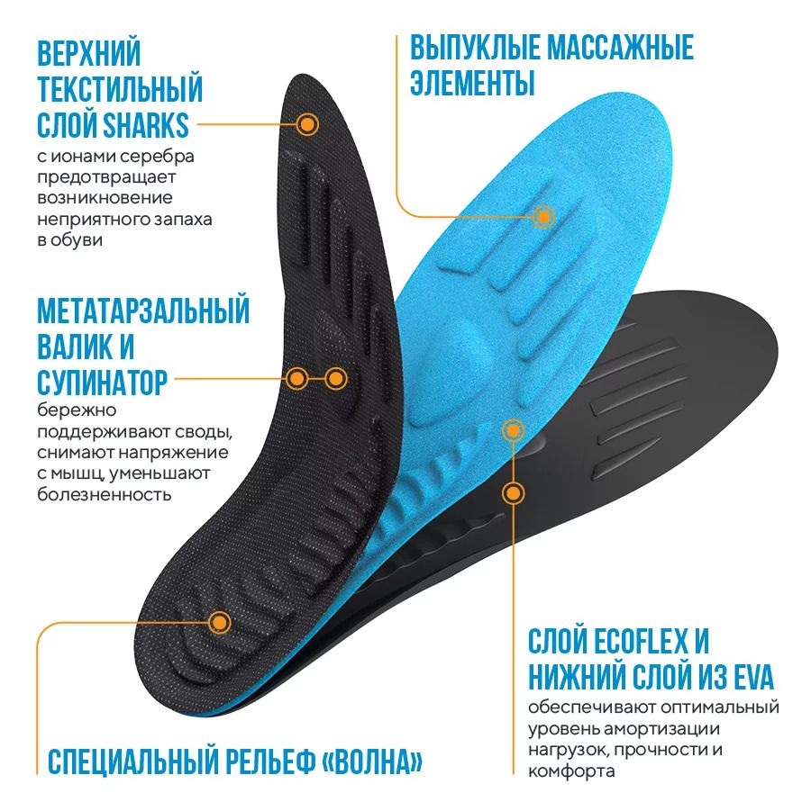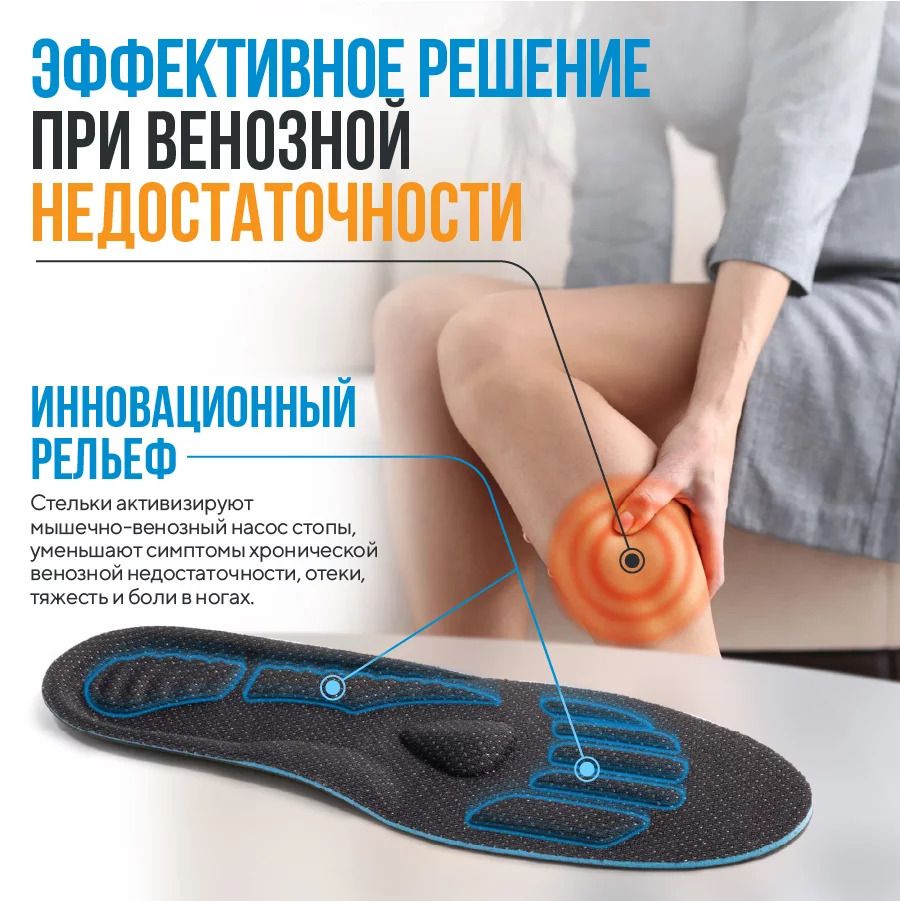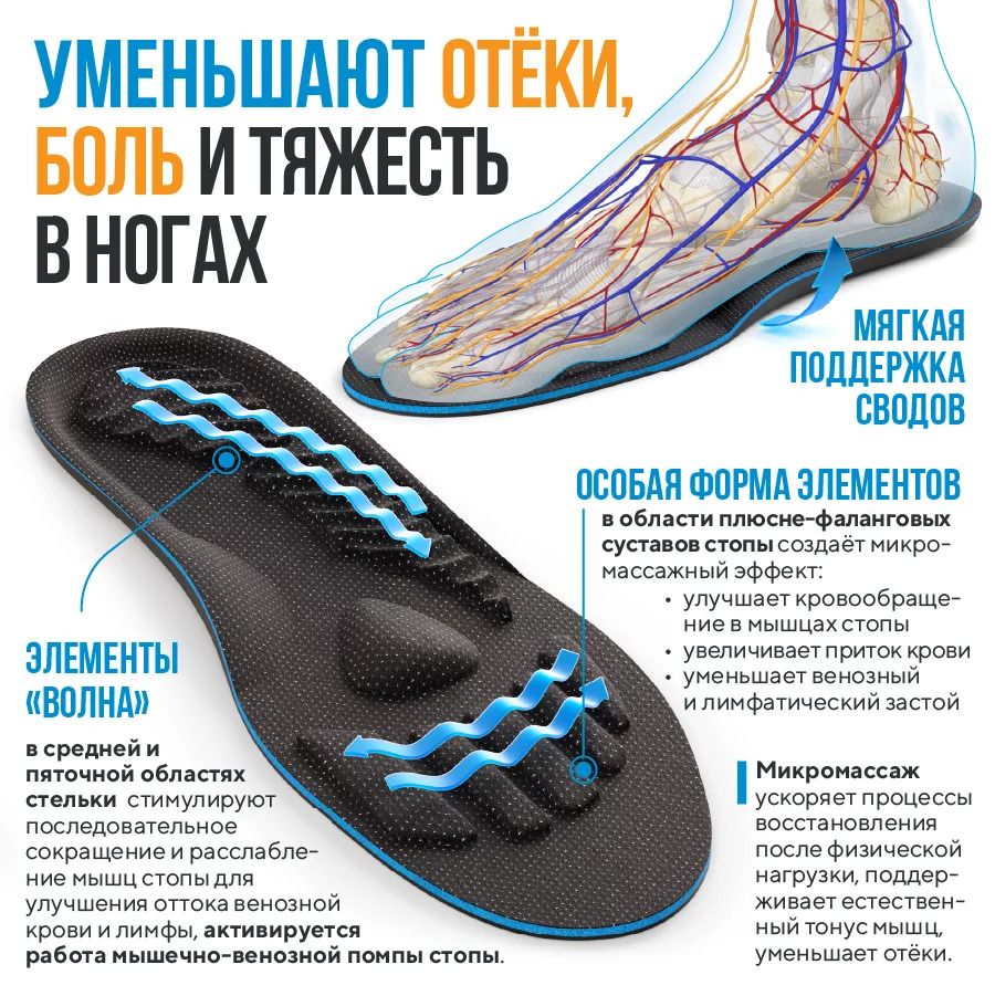 Специальные трехслойные стельки из ecoflex с особыми рельефными зонами. Стельки способствуют уменьшению отеков и болей в ногах, помогают при синдроме «тяжелых ног» и ночных судорогах ног. Подходят для повседневной, спортивной и зимней обуви.