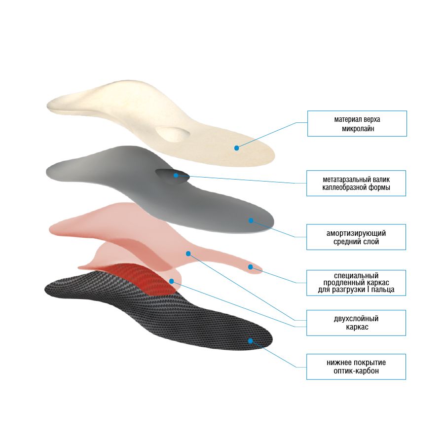 - двухслойный специальный каркас с продлением под I палец стопы для его разгрузки, компенсации толчковой функции и поддержки продольных сводов стопы;