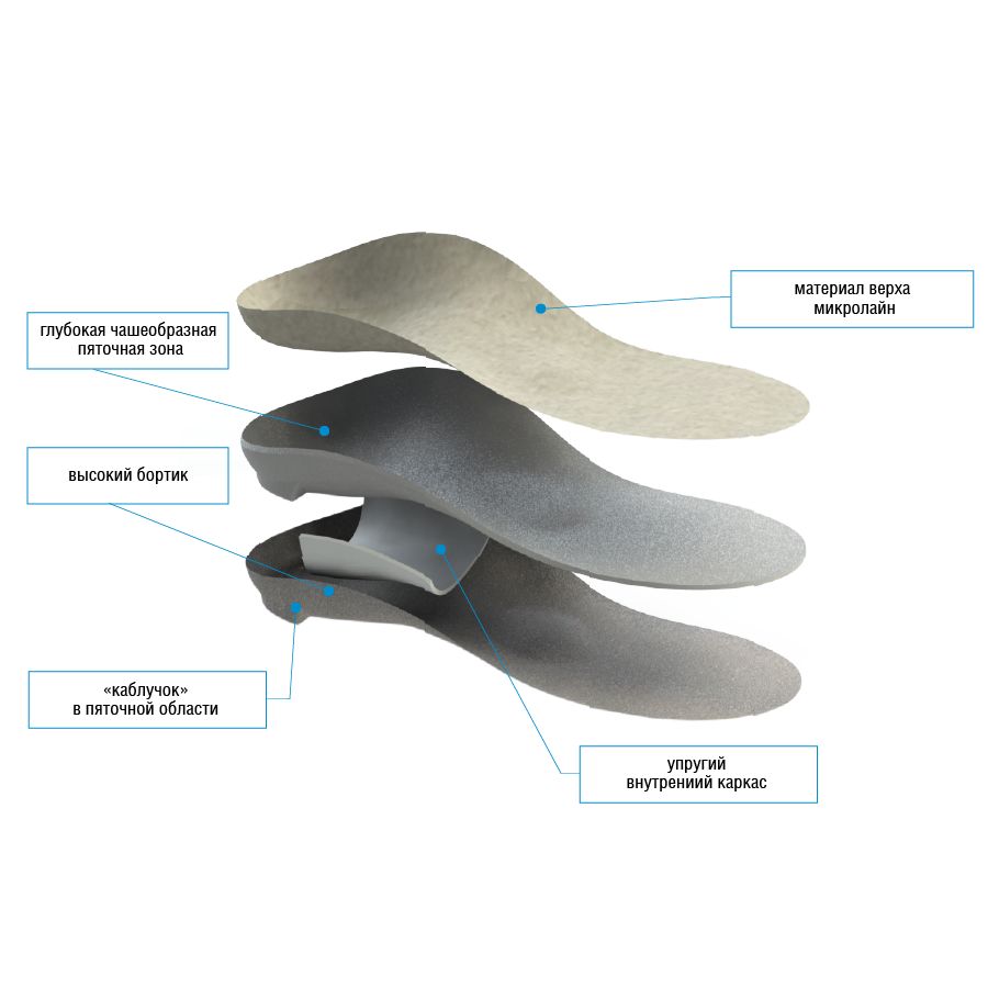 Стелька имеет высокие бортики и оказывает ярко выраженную поддержку продольному своду стопы. Данная форма хорошо корректирует боковые отклонения стопы и поддерживает ее физиологически правильную установку.
