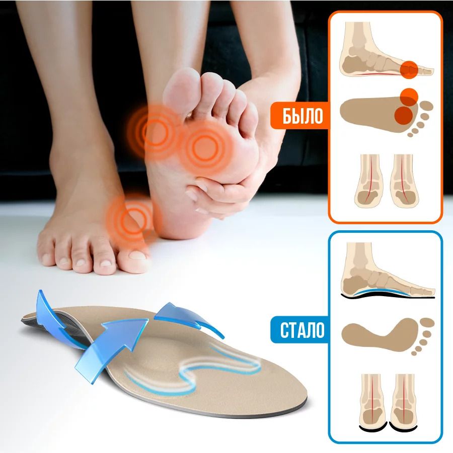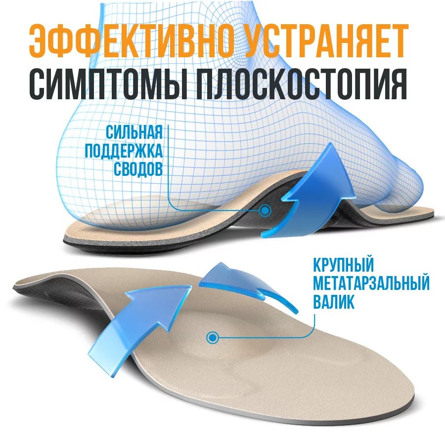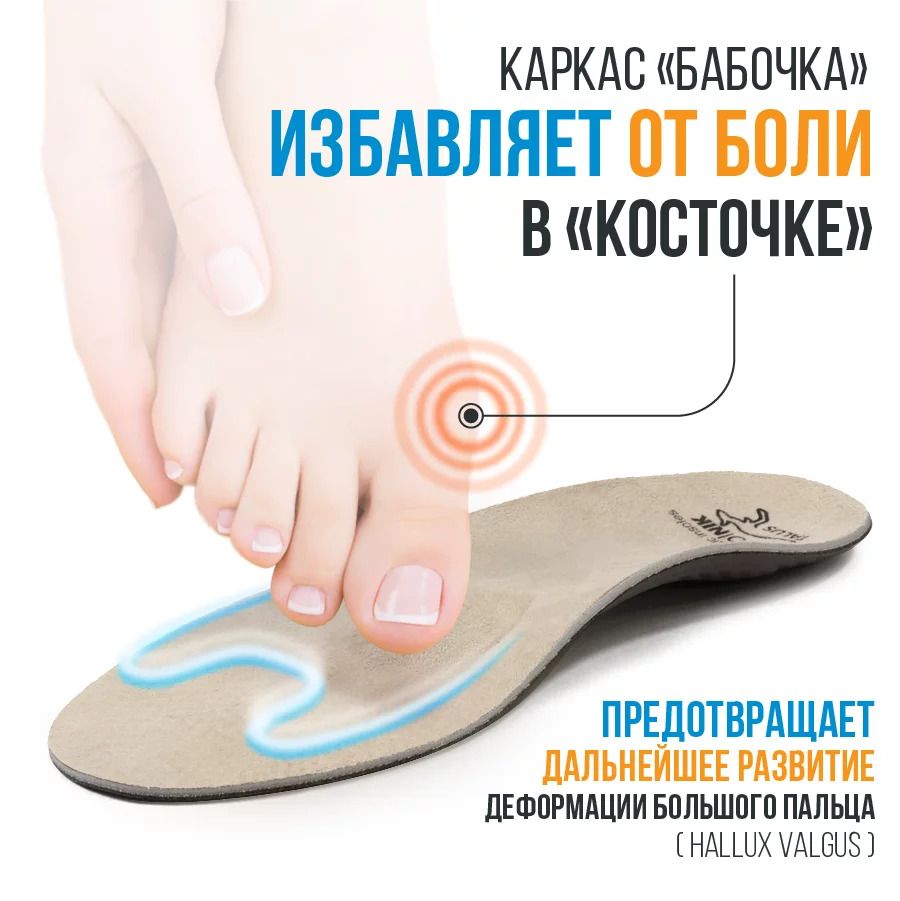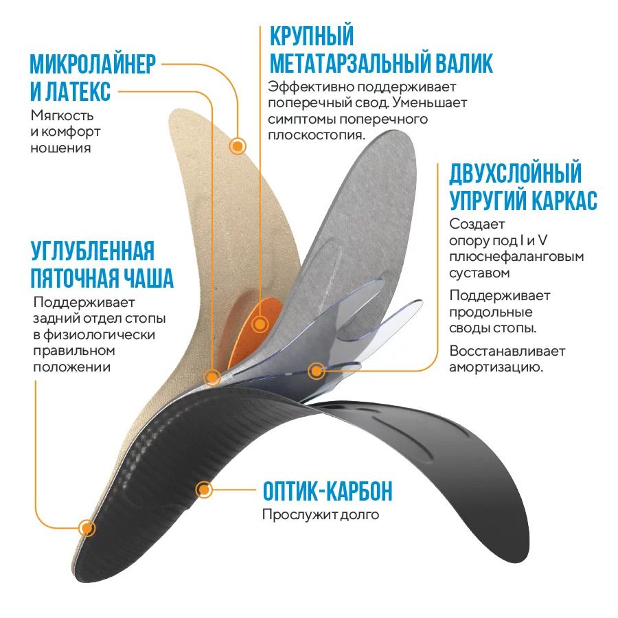 Многослойный каркас из термопластичного материала с выступами в форме "бабочка", особой формой метатарзального валика, разгружает передний отдел стопы, облегчая симптомы метатарзалгии. Чашеобразная пятка удерживает стопу в правильном положении. Поддержка продольного и поперечного свода стопы уменьшают ударную нагрузку на суставы стоп, коленные и тазобедренные суставы.
