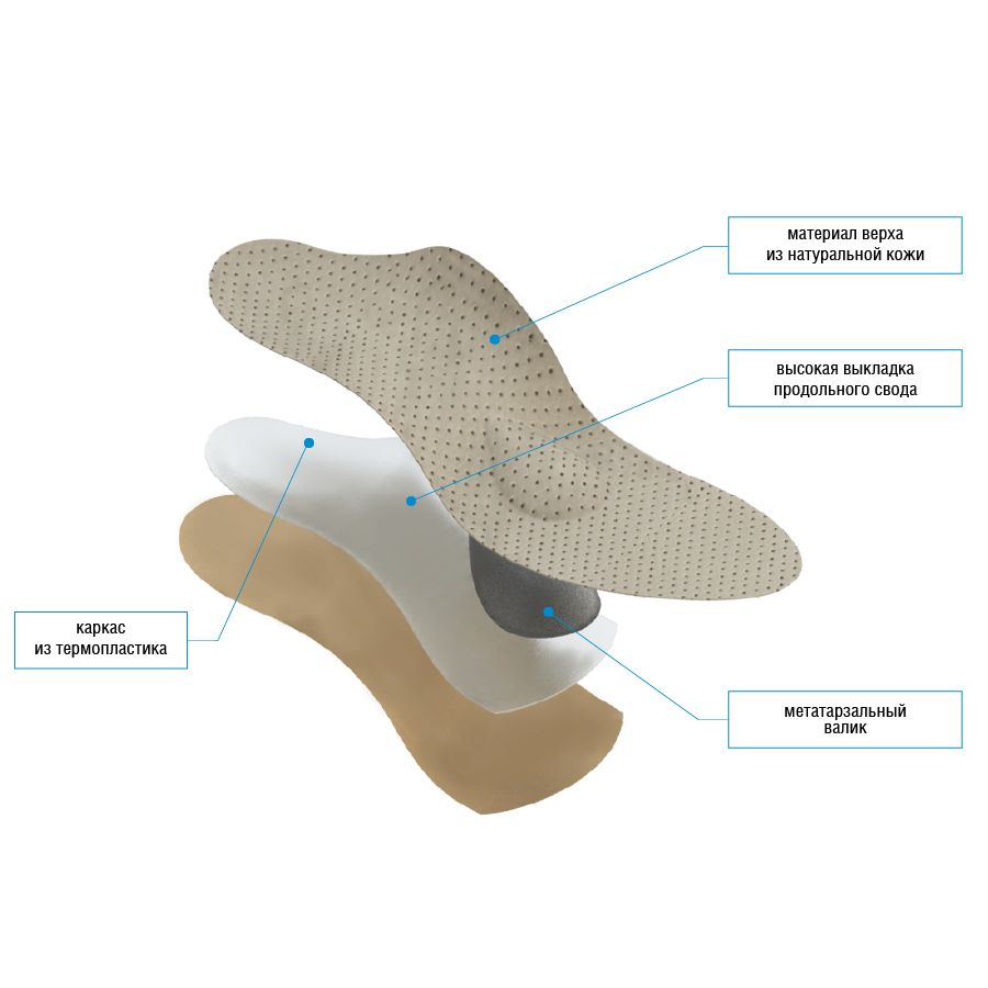 Увеличенная выкладка продольного свода поддерживает стопу, разгружая пятку и передний отдел. Подпяточная часть стельки имеет чашеобразное углубление для демпфирования ударной нагрузки при ходьбе. Крупный валик Зейца дополнительно разгружает передний отдел стопы,  предотвращая перегрузку головок плюсневых костей и развитие распластанности переднего отдела стопы.