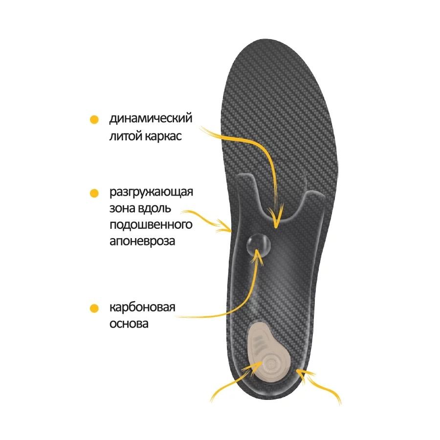 Мягкие стельки с динамическим с каркасом на карбоновой основе подходят при любом виде пяточной шпоры и болях в области пятки. Уменьшают давление в области пяточной кости, поддерживают продольный и поперечный своды стопы. Снимают усталость и боли в ногах, снижают ударную нагрузку на суставы стоп, коленные, тазобедренные суставы и позвоночник. Стельки можно подрезать в переднем отделе без потери их качества.