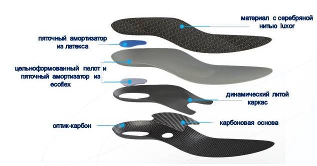 - Карбоновая основа – прочность и лёгкость каркаса, конструкция не деформируется при носке