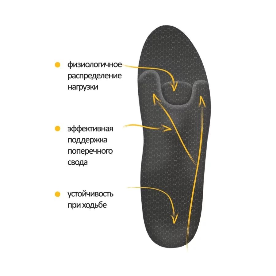 - Специальная форма каркаса “БАБОЧКА” – физиологично распределенная нагрузка для обеспечения правильной опоры стоп: разгрузка 2-4 плюсне-фаланговых суставов и опора под 1 и 5 суставами