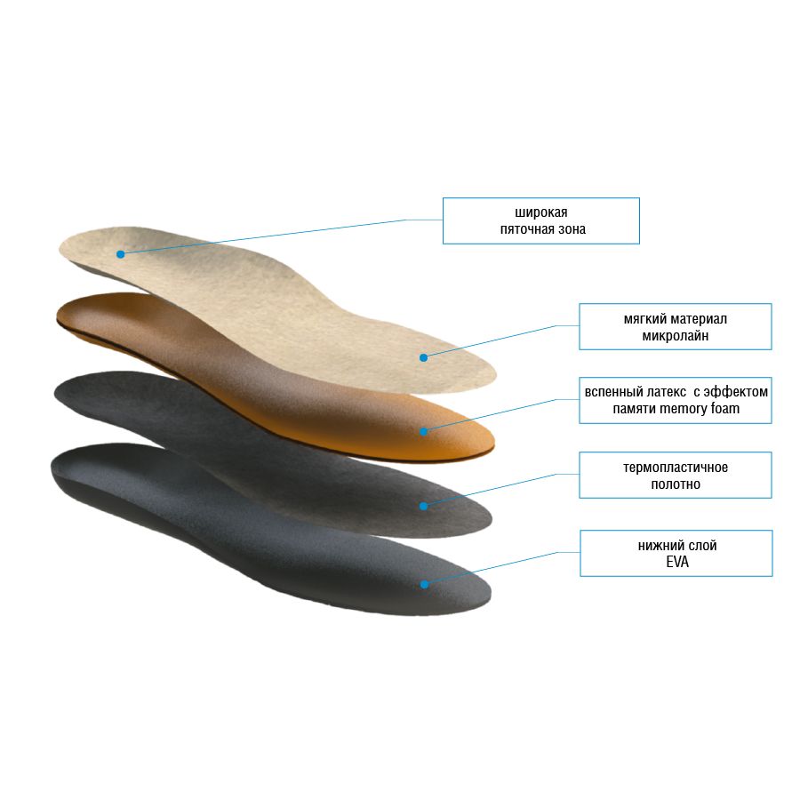 - Нижнее покрытие стелек из материала EVA с высокими амортизирующими свойствами дополнительно разгружает стопу, выполняет формообразующую функцию.