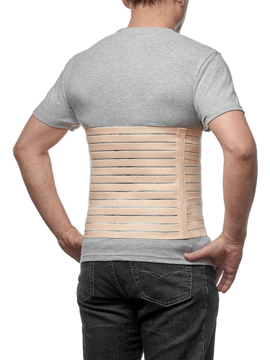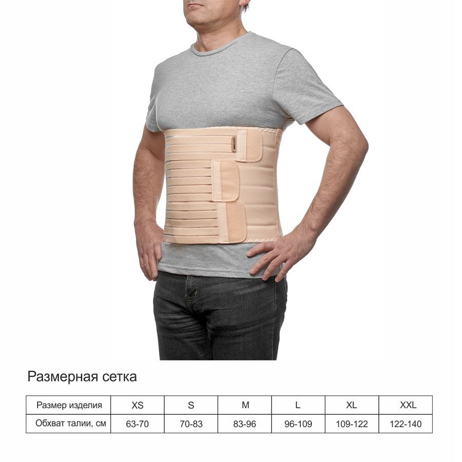 Бандаж изготовлен из эластичных воздухо- и влагопроницаемых материалов, состоит из широкого пояса на застежке с двумя ребрами жесткости по бокам. Изделие обеспечивает профилактику ущемления или прогрессирования грыж при физической работе, натуживании, при слабости мышц брюшной стенки. Обеспечивает оптимальные условия для формирования рубца после операций на органах брюшной полости или после кесарева сечения.