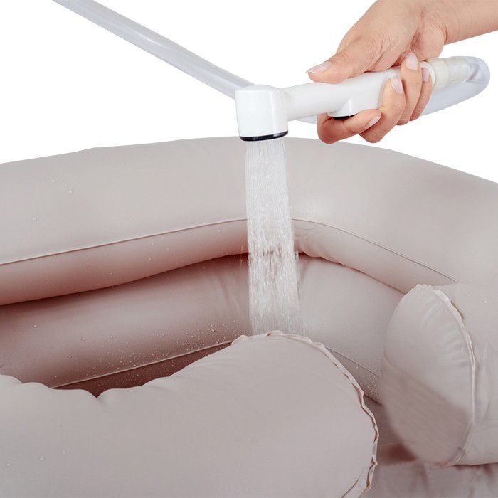 Надувной подголовник поддерживает шею и снижает давление на позвоночник. Благодаря этому гигиеническая процедура становится безопаснее (исключается риск травмы) и удобнее (не намокает спина).