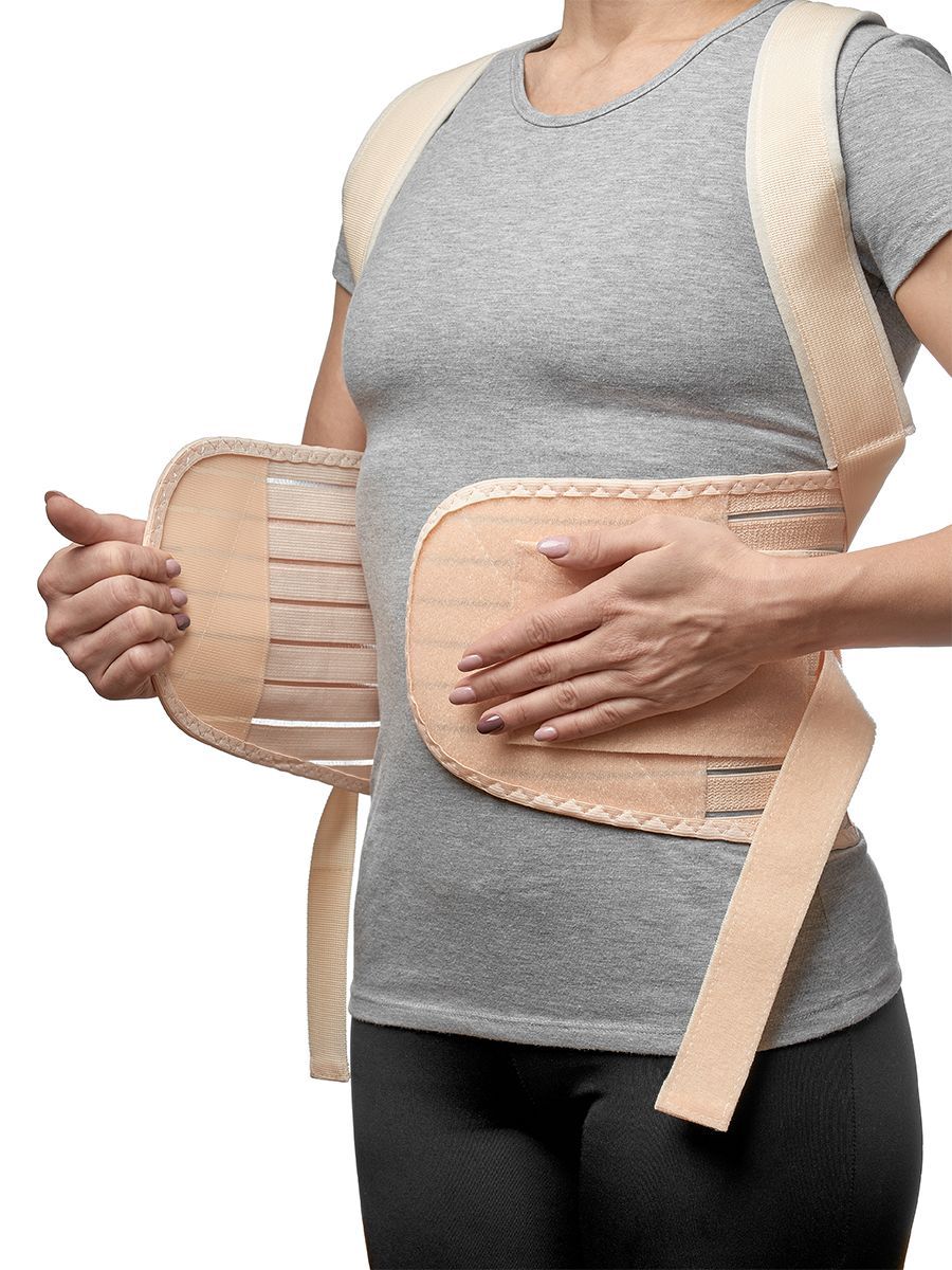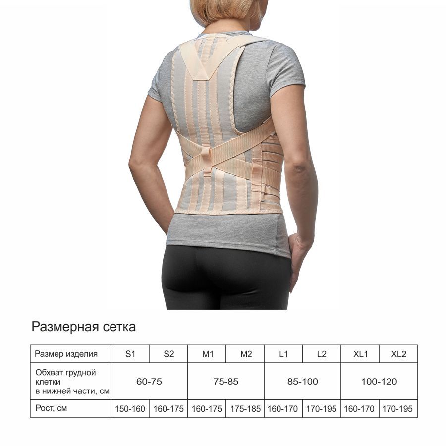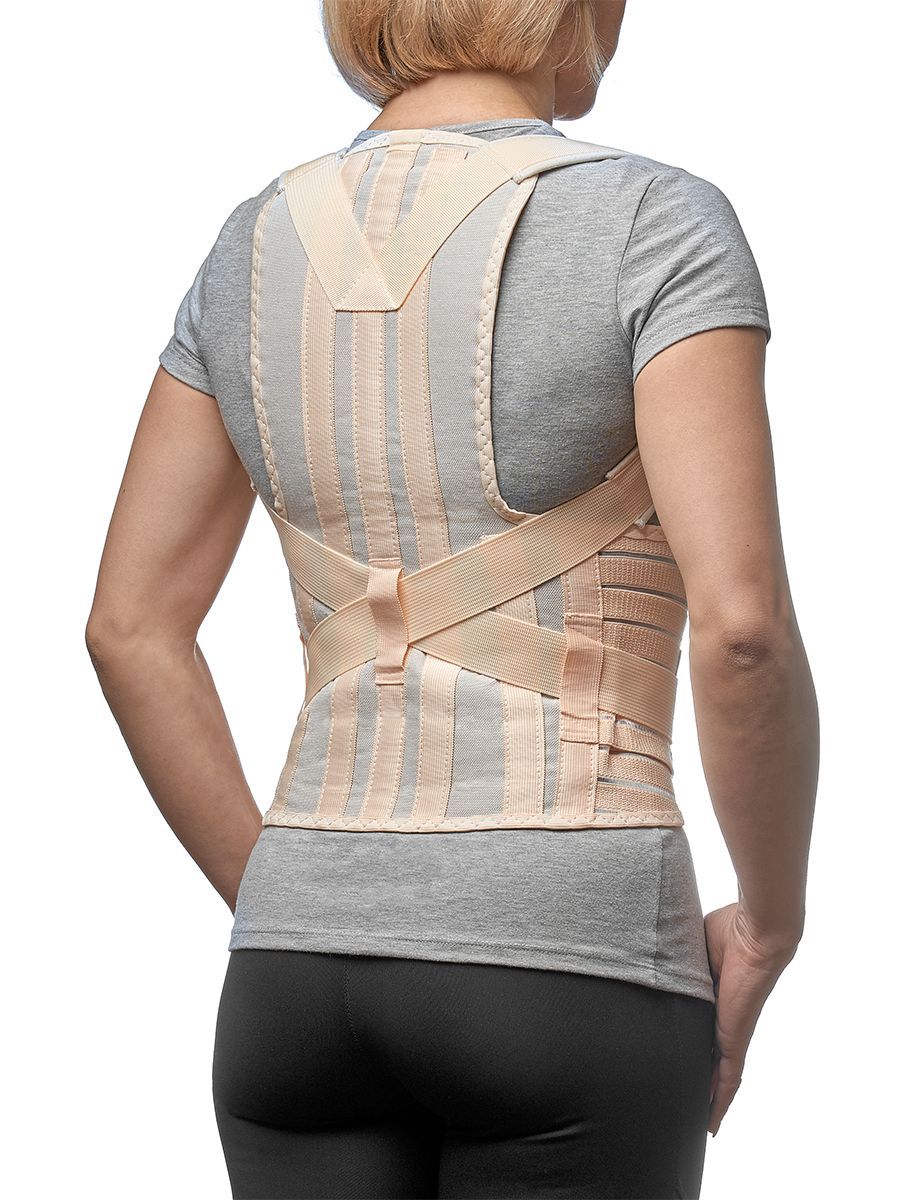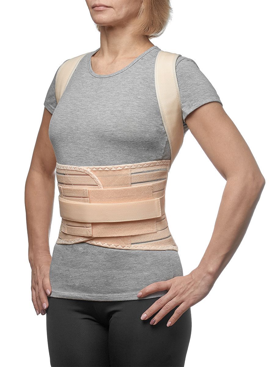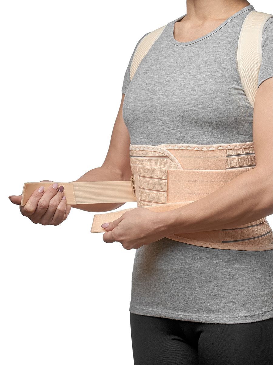 Грудо-пояснично-крестцовый корсет с нерастяжимыми реклинирующими ремнями в мягких чехлах, фиксирующихся застежкой, с четырьмя металлическими моделируемыми ребрами жесткости, с широким эластичным поясом на застежке и дополнительными стяжками.