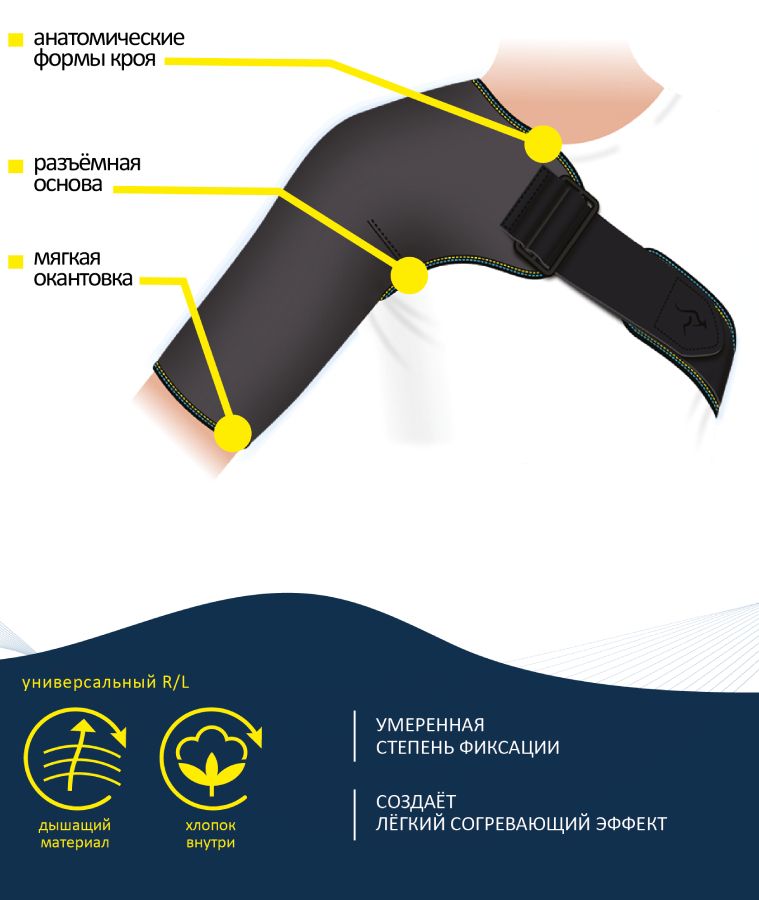 Бандаж умеренной фиксации подходит людям любой комплекции как для реабилитации, так и для профилактики травм и воспалений плечевого сустава, создает комфорт и удобство ношения за счет «дышащего» материала и анатомической формы. Обеспечивает легкий согревающий эффект.