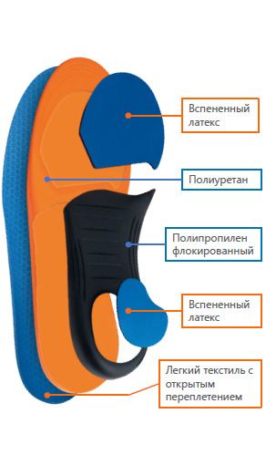 - За счет анатомически правильной вкладки основного слоя осуществляется легкая поддержка и разгрузка переднего отдела стопы. Полиуретановая основа - обеспечивает комфортность и удобство стельки при использовании.