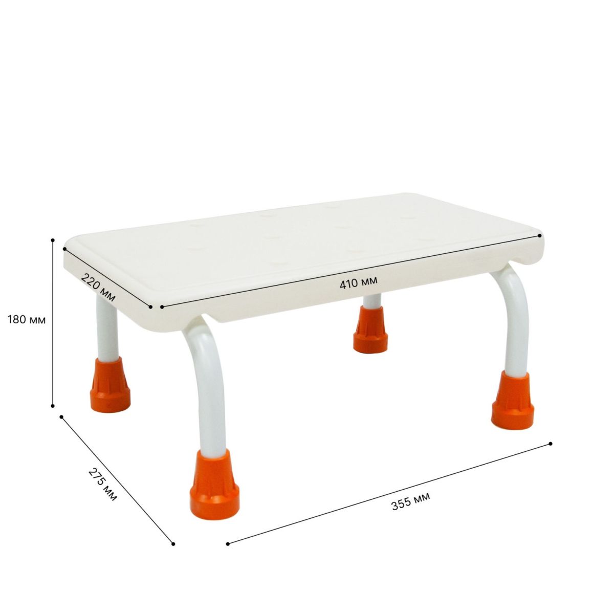 Ступенька предназначена для установки в ванные комнаты или душевые. Ступенька выполнена из высокопрочного рифленого пластика, устойчивого к воздействию воды. Конструкция рамы выполнена из стали с полимерным покрытием и не подвергается коррозии. Резиновые наконечники на всех ножках препятствуют скольжению и не оставляют следов на поверхности.