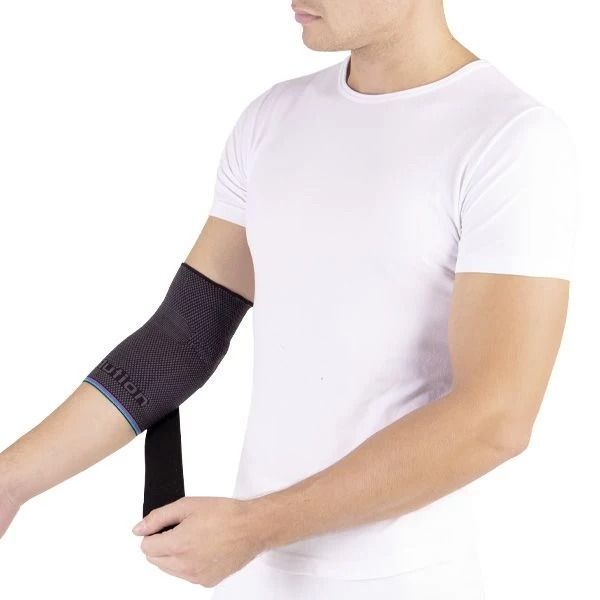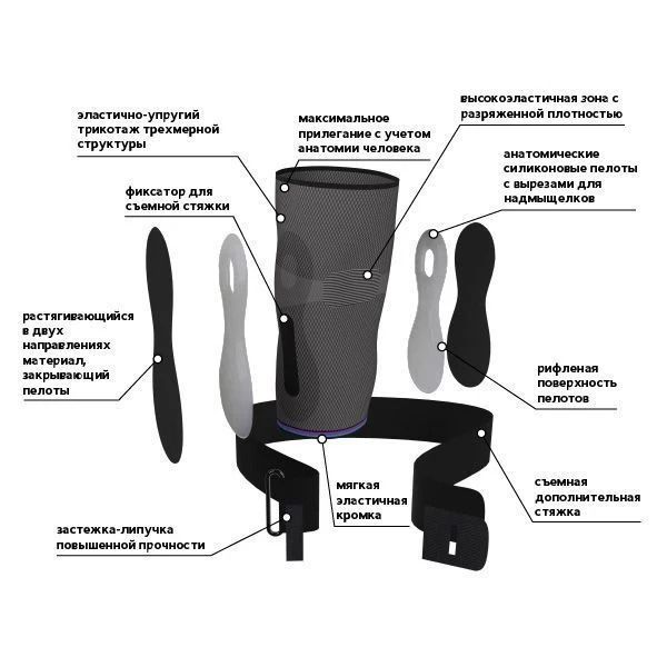 Боковые силиконовые пелоты с вырезами для надмыщелков ускоряют рассасывание отеков и обеспечивают плотное прилегание бандажа. Рифленая поверхность пелотов оказывает рефлексогенное и массажное действия, а съемная дополнительная стяжка с прочной износостойкой застежкой регулирует степень фиксации. В месте сгибания сустава расположена специальная высокоэластичная зона с разряженной плотностью, благодаря чему бандаж комфортен при длительном использовании, исключает натирание кожи и нарушения микроциркуляции.