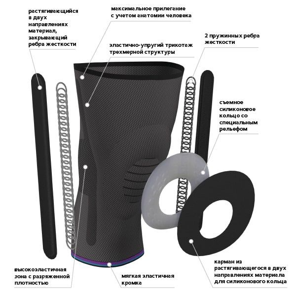 Эластичная манжета с силиконовым внутренним покрытием (зона-стопер) препятствует смещению бандажа, а специальная высокоэластичная зона с разряженной плотностью под коленкой исключает натирание кожи и дискомфорт при длительном использовании. Съемное силиконовое кольцо анатомической формы со специальным рельефом разгружает и стабилизирует надколенник. 2 боковых пружинных ребра жесткости препятствуют смещению бандажа при движении, разгружают коленный сустав.