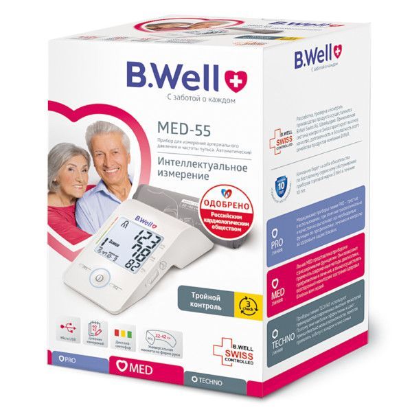 Тонометр B.Well MED-55 с манжетой B.Well MA-C-ML (22-42 см.) является точным, надежным и современным автоматическим прибором для измерения артериального давления и частоты пульса на плечевой зоне. Питание прибора от сетевого адаптера с Micro USB (не входит в комплект поставки) или батареек типа AAA. Тонометр оснащен расширенным набором потребительских функций и предназначен для использования как в медицинских учреждениях, так и в домашних условиях.